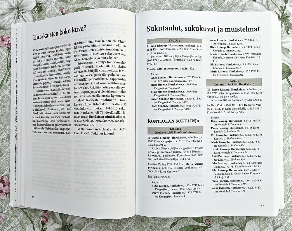 Kiteen Hurskaisten sukukirja on yli 900-sivuinen teos, joka on julkaistu vuonna 2013. Tämän teoksen avulla pääset helposti tutustumaan menneisiin sukupolviin ja mielenkiintoisiin tapahtumiin aina 1600-luvulle saakka.